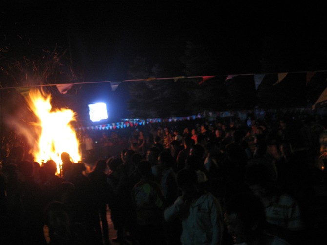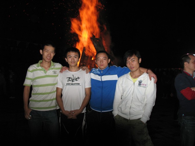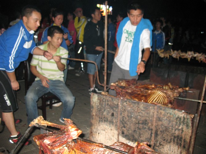 耍到5点半大家才分手,我们前往虹口风景区。虹口是大渡河漂流训练基地,也山地车训练基地,而且是猕猴桃盛产的地方,到处都是猕猴桃。到了后,我们签到,领参赛号等等一些参赛的用具后,我们就去熟悉了一下赛道,最后到我们下榻的地方简普寨,哪里的猕猴桃更多。找到房间,吃过晚饭。主委会通知广场集合开篝火晚会,吃烤羊,烤鸡。我们几个带上攀爬车前去,人很多。好像西昌的火把节一样,还有少数民族的和我们一起狂欢,我和轮子还亲自去感受了哈烤全羊