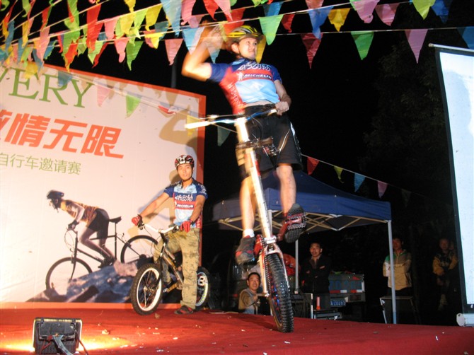 舞台上节目不断,舞台下很嗨。大家都热情投入进去,最后主持人给我们安排了一个节目。让我们去带动更嗨的气氛,我们就用攀爬车一个一个地飞上去,没有想到的是,大家都被我们上舞台的动作震撼了,虽然大家都是耍车,但是我们耍的是技术性车技,更是极限运动。表演中尖叫声更是不断,后来邀请了几个山地车车手上台体验,节目做的很嗨!到篝火要完了,大家才余情未了地散了,我们几个商议夜摘猕猴桃,我和小凤,游佳和轮子,攀爬开车放哨,由于猕猴桃太多了,3分钟都没有要到,摘了两大口袋。回到住宿各自休整备战第二天的比赛